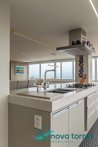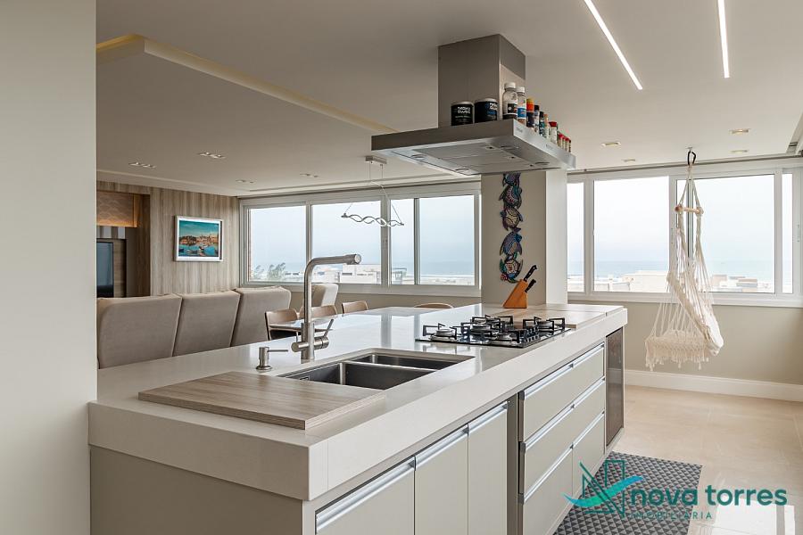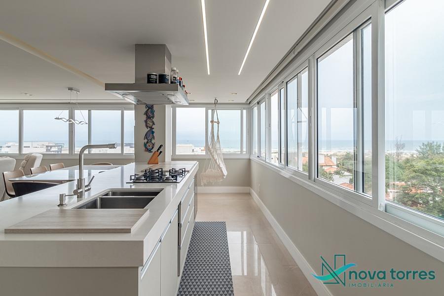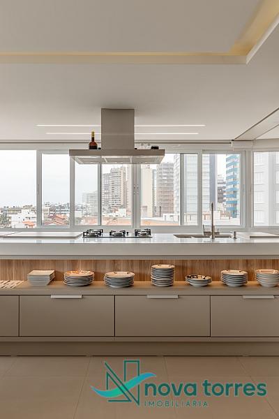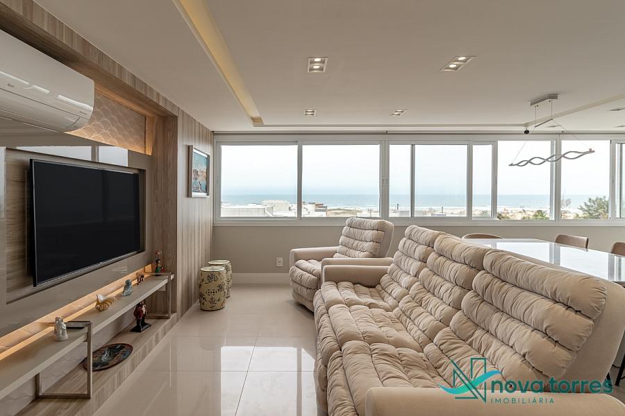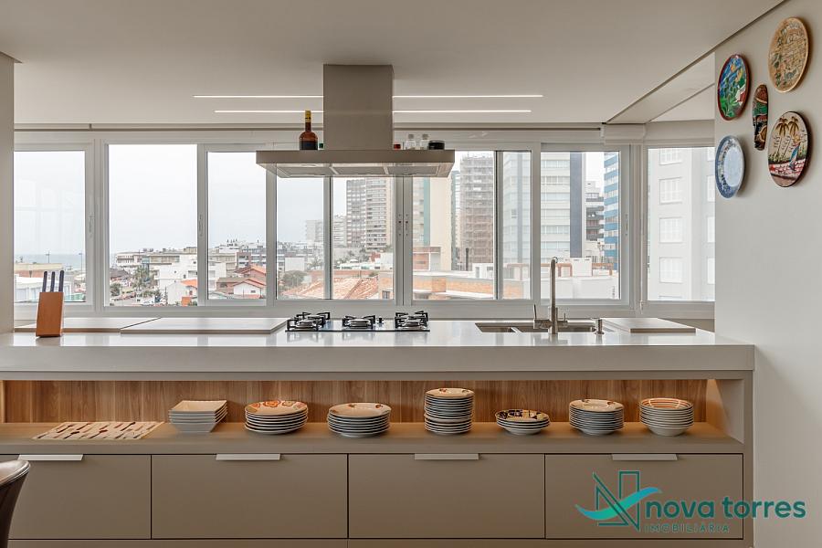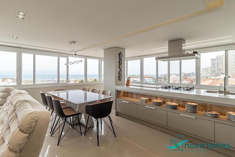 O espaçoso living de três ambientes integra perfeitamente a sala de estar e jantar, criando um ambiente acolhedor para receber amigos e familiares. A área gourmet com parrilla é ideal para desfrutar de momentos memoráveis enquanto aprecia a vista eterna para o mar e quatro praças.