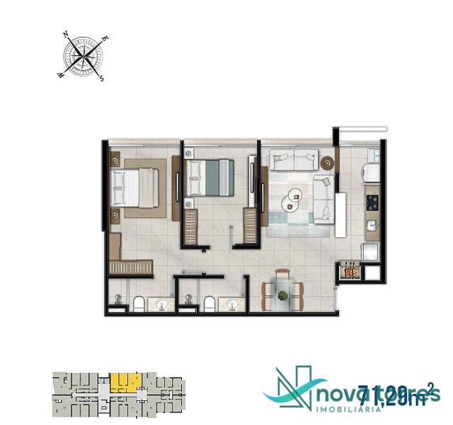 Excelente apartamento mobiliado e decorado com 2 dormitórios, sendo 1 suíte, 01 banheiro social, sala de estar e jantar integradas, cozinha americana, churrasqueira, área de serviço e box duplo de garagem.