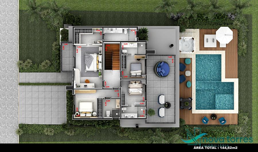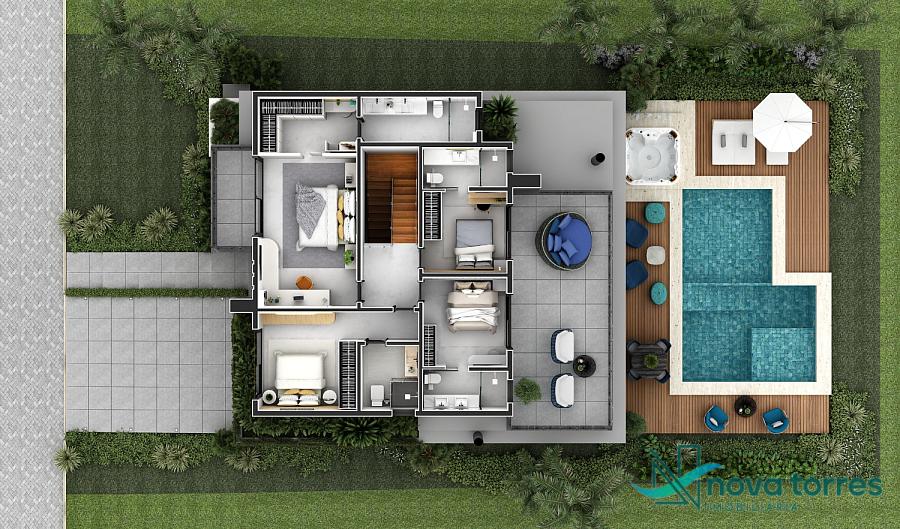 Segundo pavimento: área íntima composta por uma ampla suíte master com closet e sacada, duas suítes com sacada e uma suíte com floreira, proporcionando charme e exclusividade a cada ambiente.