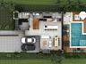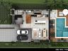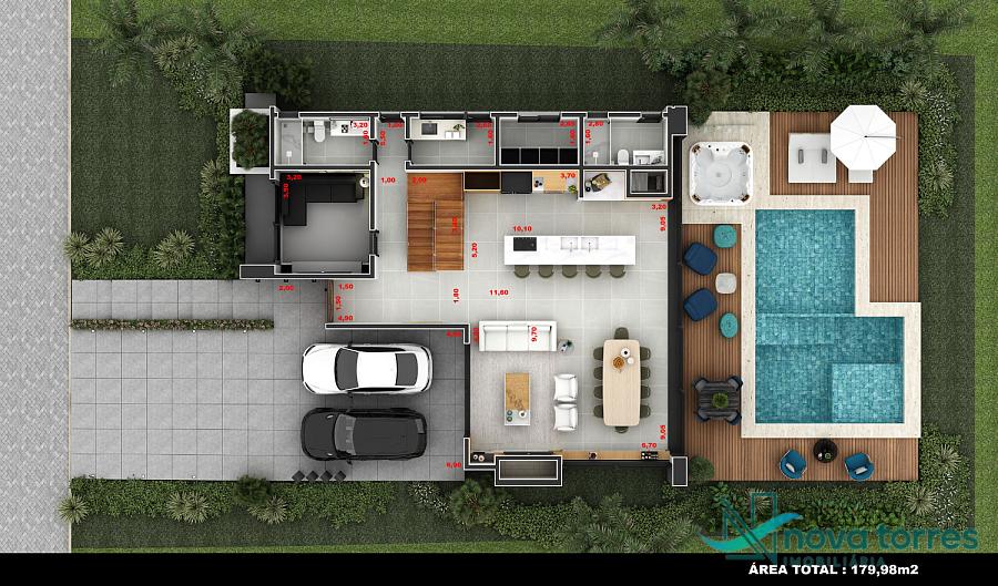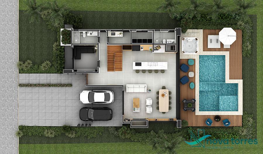 Térreo: abrigo para 2 carros, varanda convidativa, living com cozinha e jantar integrados, além de uma sala de TV independente que garante mais privacidade. Conta ainda com lareira a lenha, churrasqueira, depósito, lavanderia, 1 banheiro social e 1 banheiro externo para maior praticidade.