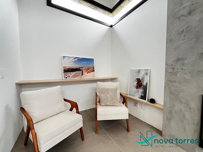 Casa com 225m² construídos sobre terreno de 14x30m, com frente leste. Projeto automatizado, com esquadrias em PVC e excelente padrão de acabamento. Conta com 3 suítes, lavabo social e lavabo de serviço. Fundos voltados para área de mata com vista para o pôr do sol, garantindo privacidade e contato com a natureza. Possui espera para piscina e para placas solares.