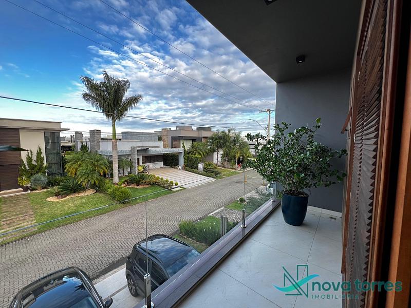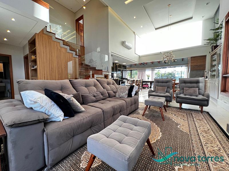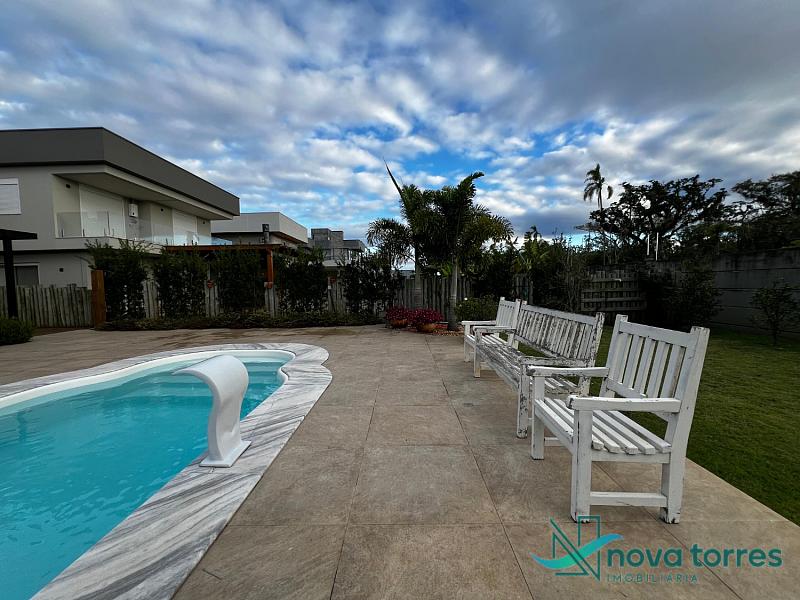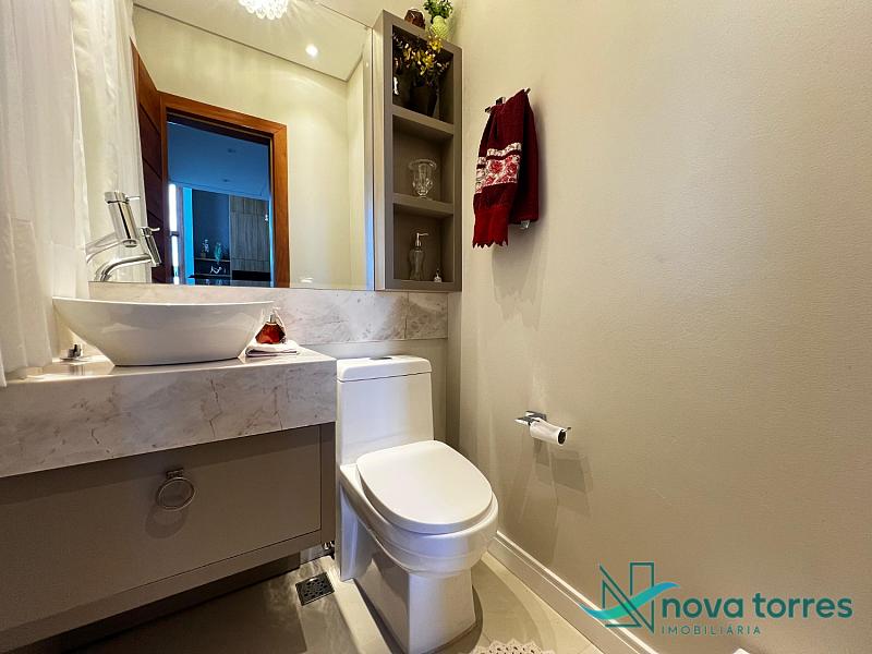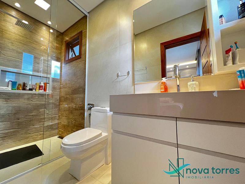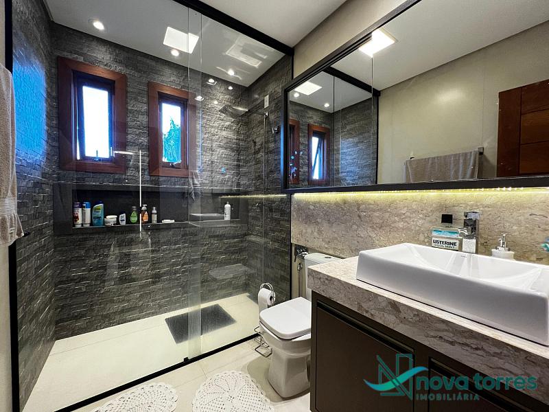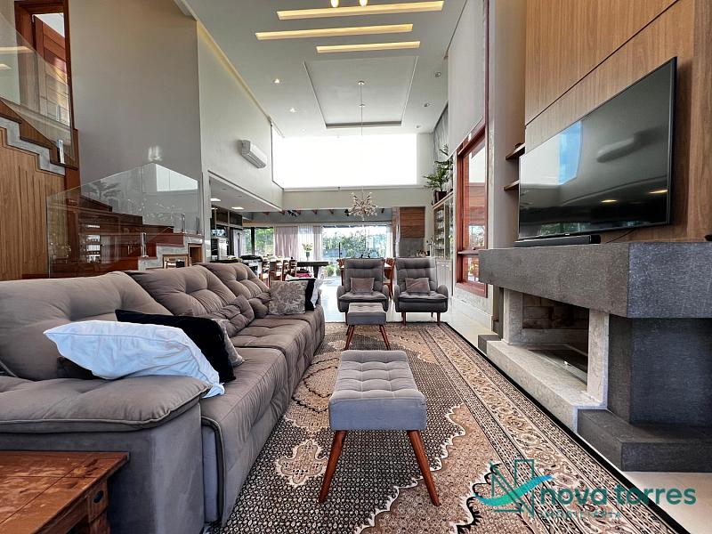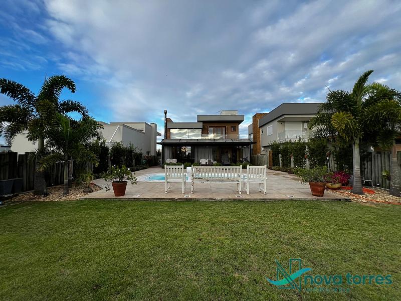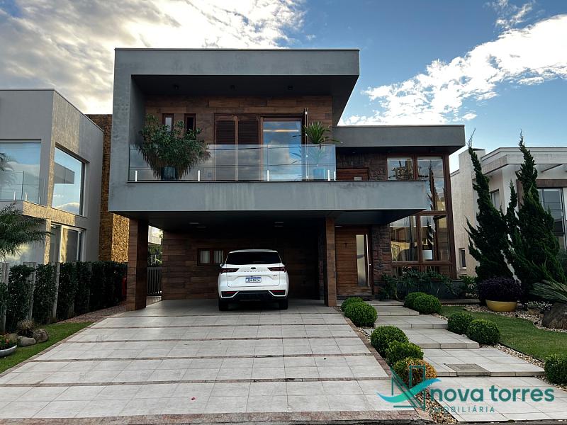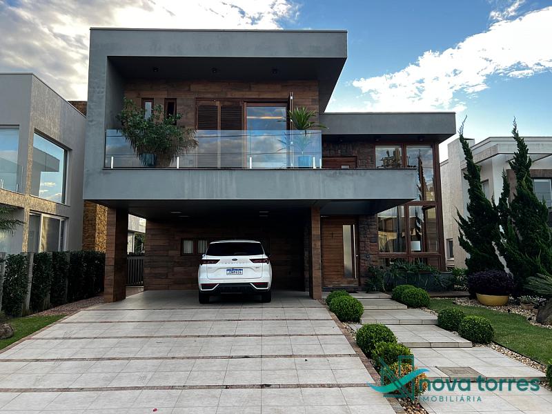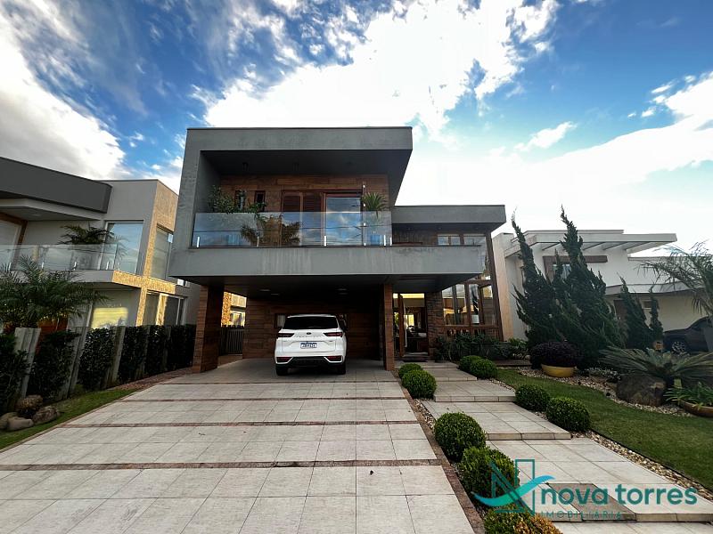 Residência de alto padrão no condomínio Reserva das Águas, com projeto contemporâneo, ambientes generosos e acabamentos sofisticados. Com 350 m²de área construída,  em um excelênte  terreno com posição solar leste-oeste. A casa se destaca pelo conforto, funcionalidade e elegância em cada detalhe. Distribuída em dois pavimentos, conta com 3 suítes, sendo uma delas com closet privativo, além de lavabo, banheiro social e espaços de convivência amplos e integrados. A área social possui sala de estar com pé-direito duplo, sala de jantar, cozinha americana com móveis planejados e espaço gourmet com churrasqueira, totalmente voltado para o lazer. Na área externa, um jardim impecável emoldura a piscina aquecida, cercada por deck e paisagismo, ideal para aproveitar ao ar livre com privacidade. A casa também possui placas solares, garantindo eficiência energética, além de internet instalada, lareira, ar-condicionado e aquecimento de água. Com duas vagas de garagem privativas, acabamentos em gesso, piso em porcelanato e esquadrias amplas que valorizam a luz natural, a residência oferece ainda entrada de serviço, lavanderia e varanda integrada. O condomínio entrega infraestrutura completa de lazer e segurança: portaria 24h, piscinas (térmica, adulto e infantil com deck molhado), sauna, salão de festas, espaço fitness, brinquedoteca, playground, mini mercado, espaço zen, pet place, quadras de tênis, padel e poliesportiva, além de quiosques e sala de jogos. Um imóvel ideal para quem valoriza sofisticação, conforto e qualidade de vida em um dos endereços mais desejados de Torres.