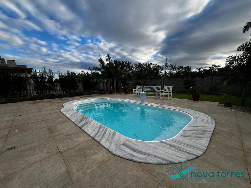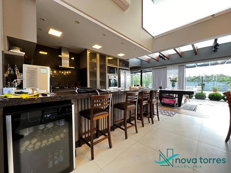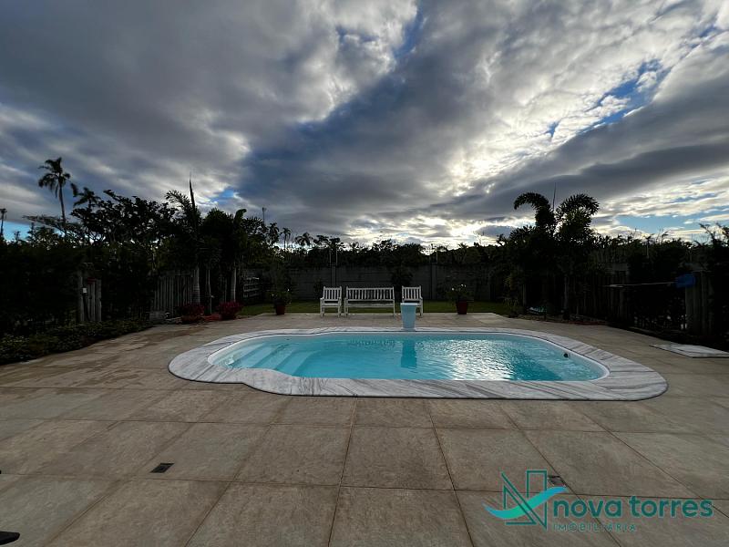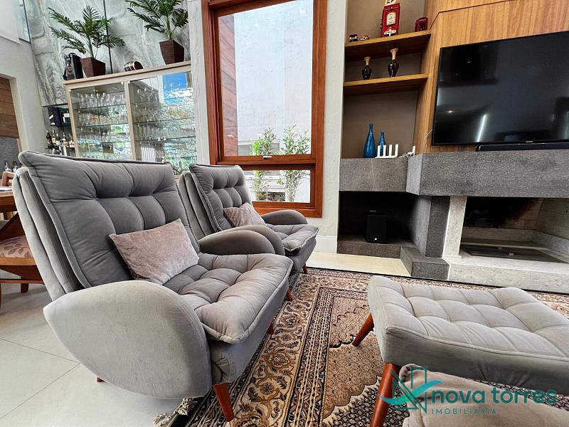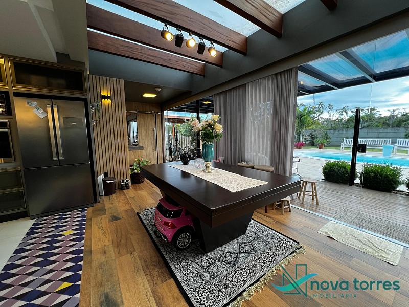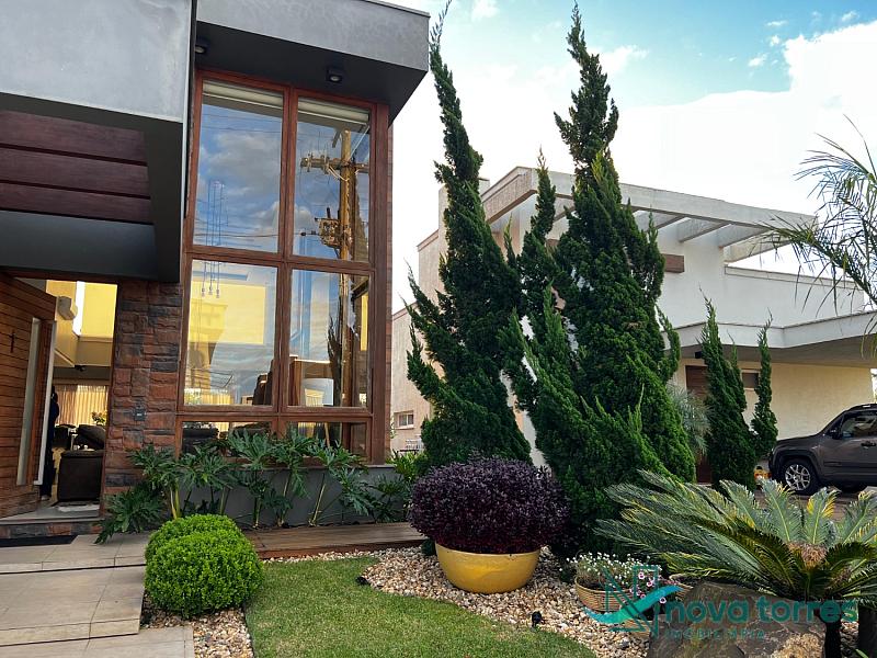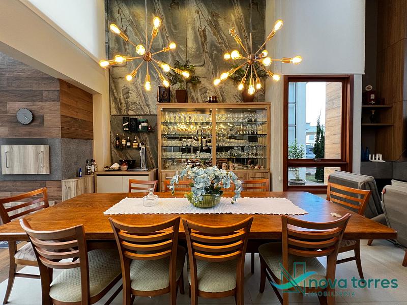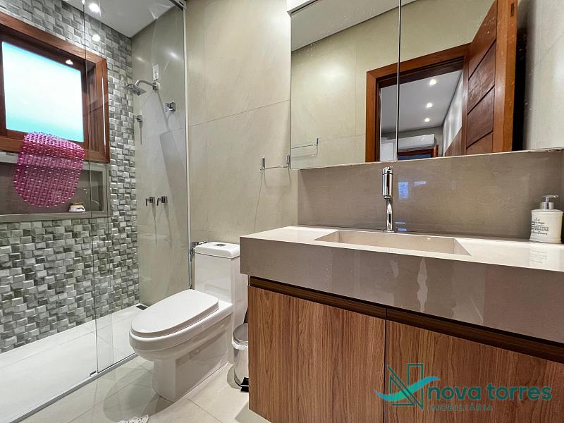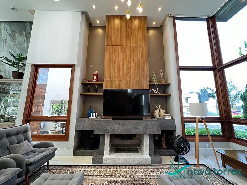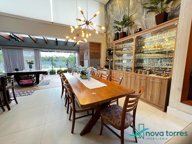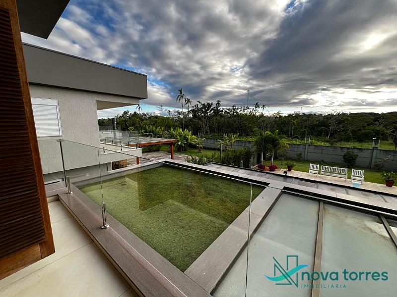 Residência de alto padrão no condomínio Reserva das Águas, com projeto contemporâneo, ambientes generosos e acabamentos sofisticados. Com 350 m²de área construída,  em um excelênte  terreno com posição solar leste-oeste. A casa se destaca pelo conforto, funcionalidade e elegância em cada detalhe. Distribuída em dois pavimentos, conta com 3 suítes, sendo uma delas com closet privativo, além de lavabo, banheiro social e espaços de convivência amplos e integrados. A área social possui sala de estar com pé-direito duplo, sala de jantar, cozinha americana com móveis planejados e espaço gourmet com churrasqueira, totalmente voltado para o lazer. Na área externa, um jardim impecável emoldura a piscina aquecida, cercada por deck e paisagismo, ideal para aproveitar ao ar livre com privacidade. A casa também possui placas solares, garantindo eficiência energética, além de internet instalada, lareira, ar-condicionado e aquecimento de água. Com duas vagas de garagem privativas, acabamentos em gesso, piso em porcelanato e esquadrias amplas que valorizam a luz natural, a residência oferece ainda entrada de serviço, lavanderia e varanda integrada. O condomínio entrega infraestrutura completa de lazer e segurança: portaria 24h, piscinas (térmica, adulto e infantil com deck molhado), sauna, salão de festas, espaço fitness, brinquedoteca, playground, mini mercado, espaço zen, pet place, quadras de tênis, padel e poliesportiva, além de quiosques e sala de jogos. Um imóvel ideal para quem valoriza sofisticação, conforto e qualidade de vida em um dos endereços mais desejados de Torres.