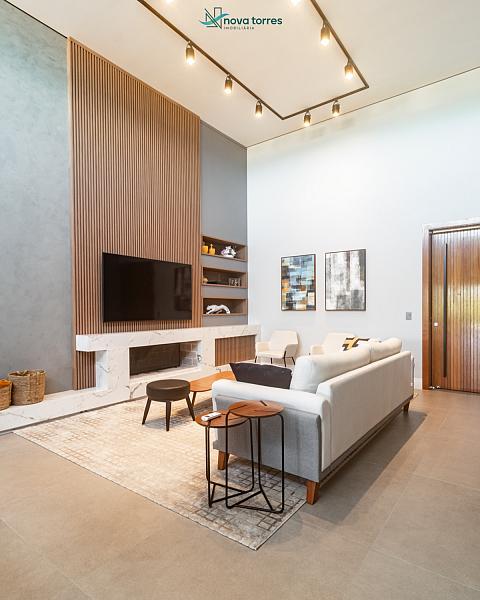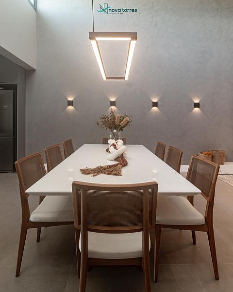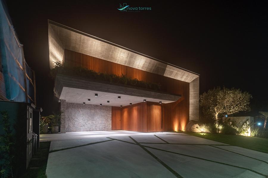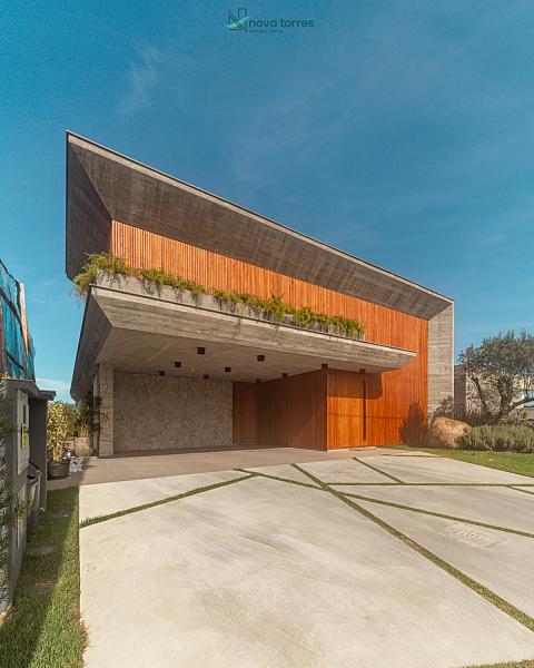 Casa moderna com arquitetura contemporânea e linhas retas, inspirada em elementos naturais como a pedra e a madeira. A escolha desses elementos traz uma sensação de conexão com a natureza e adiciona um toque de elegância e sofisticação ao imóvel.