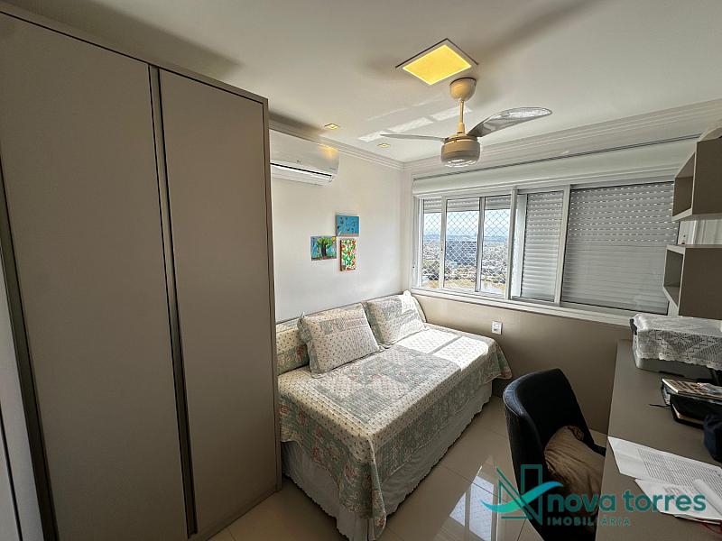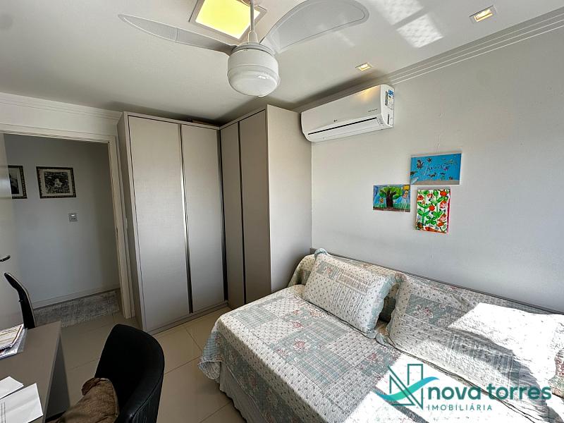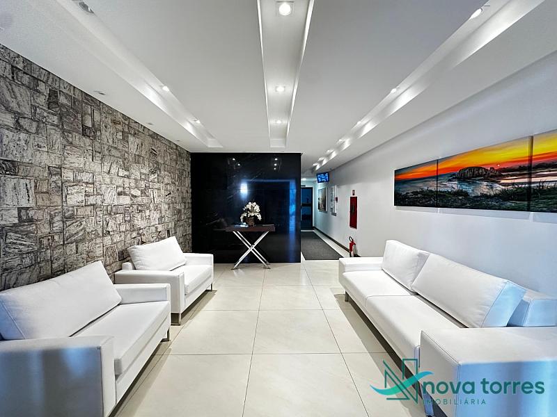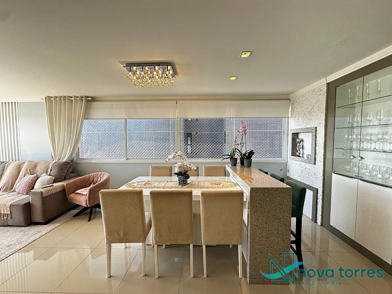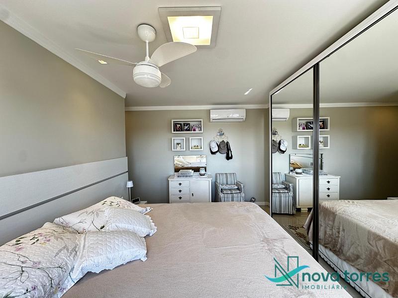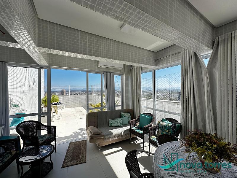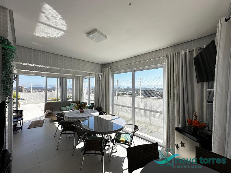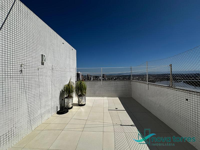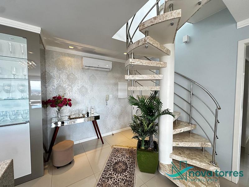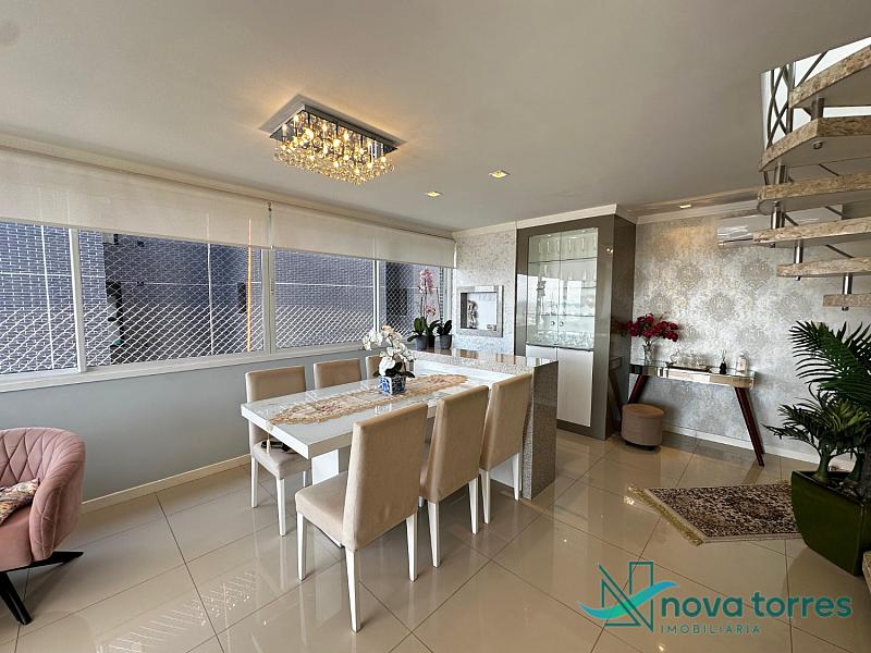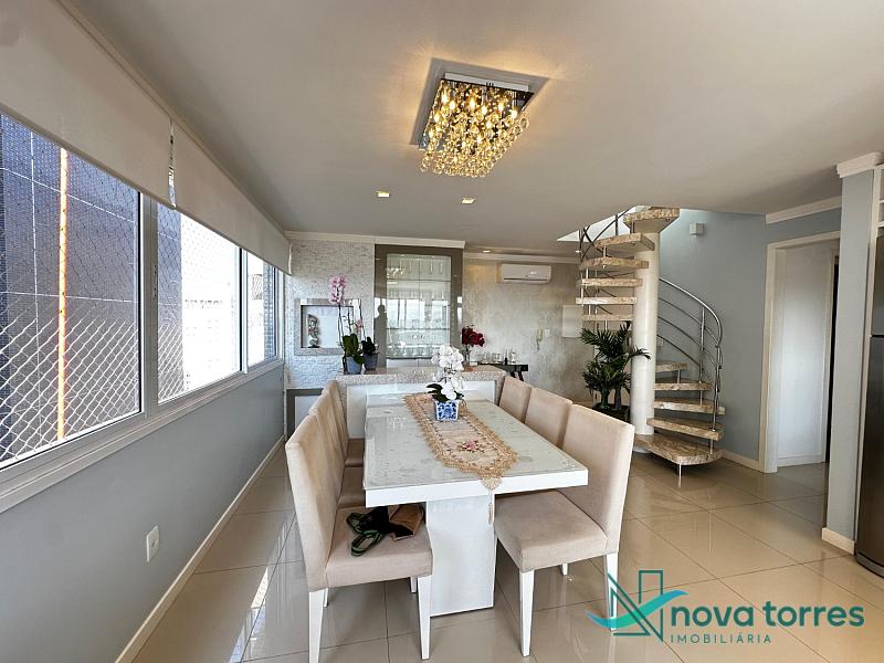 Cobertura duplex no edifício River Side, em Torres, RS, com 174 m² de área total. O imóvel dispõe de três dormitórios, sendo uma suíte, além de lavabo e banheiro social. Ambientes bem distribuídos, incluindo sala de estar, sala de jantar, copa, cozinha, despensa, espaço gourmet e área de serviço. O terraço proporciona uma vista ampla para o rio e para o mar, integrando ainda mais conforto e lazer ao imóvel. A cobertura conta com móveis planejados, decoração diferenciada, acabamento em gesso, piso em porcelanato, ar condicionado, aquecimento de água e churrasqueira. Localizada em andar alto, oferece vista livre privilegiada e duas vagas de garagem numeradas. O empreendimento apresenta estrutura completa, com salão de festas, hall decorado e mobiliado, elevador, gás central, medidores individuais, portão eletrônico, câmeras de segurança e acessibilidade para PNE.