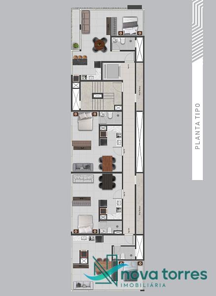 Residencial de arquitetura moderna e funcional em Torres/RS, com 10 pavimentos e 28 apartamentos no formato studio, disponíveis em três tipos de plantas. Os ambientes integrados valorizam a praticidade e o conforto, com opções que incluem sacada e churrasqueira.