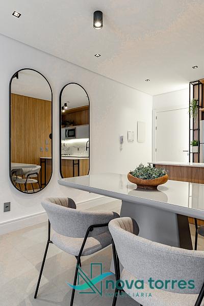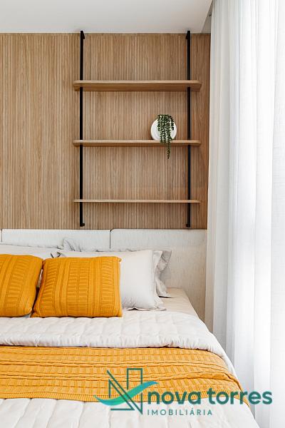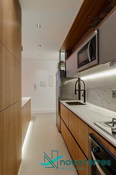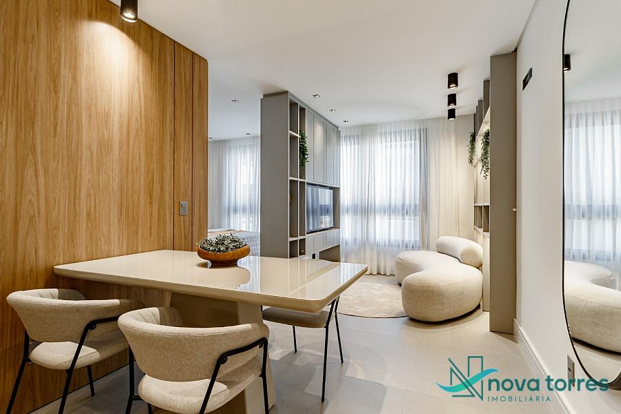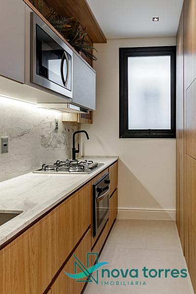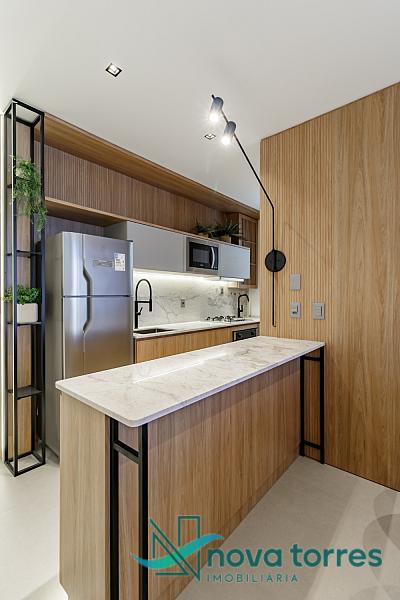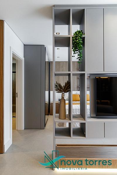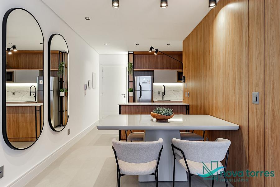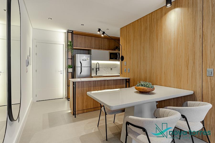 Lindo Studio completamente mobiliado e decorado, com 43,0m², possui linda cozinha tipo americana, com churrasqueira e área de serviço integrada. Ótimo living com salas de estar e jantar integradas, com TV giratória para o dormitório, e 1 banheiro social.